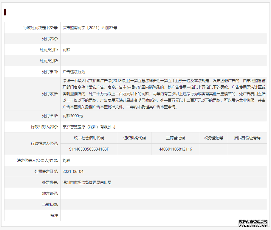 危機(jī)公關(guān):中國網(wǎng)財(cái)經(jīng)6月7日訊 日前,深圳市市場監(jiān)管局發(fā)布的“行政處罰公示”顯示,掌護(hù)智慧醫(yī)療(深圳)有限公司因廣告違法行為,被罰3000元。