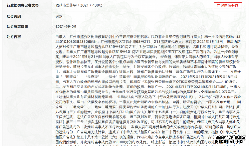 信用中國官網顯示,廣州市越秀區(qū)市場監(jiān)督管理局認為上述行為違法內容有二: 一是發(fā)布使用“‘國家級’、‘最高級’、‘最佳’等用語”同類型的絕對化用語的廣告; 二是發(fā)布利用受益者的名義或者形象作推薦、證明的教育、培訓廣告。